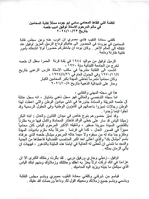 The eulogy delivered by the Beirut Bar Association upon the passing of Our Founder